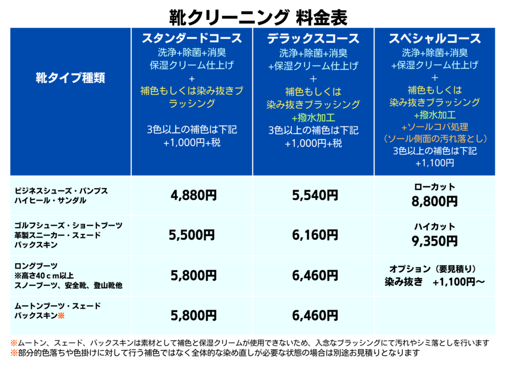 ※起毛タイプ(スェード、ムートン、バックスキン)は補色及び保湿クリーム仕上げができない素材のため、入念なブラッシングを行います - タイプ別靴クリーニング基本料金表→